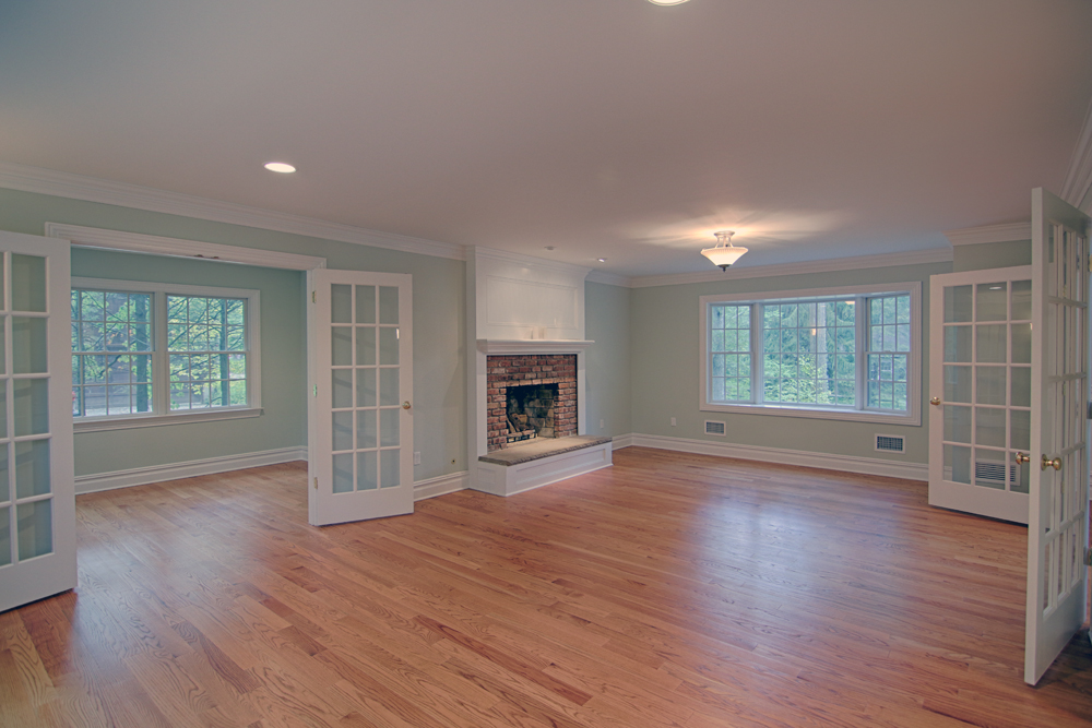 The bright and airy living room offers a gas fireplace with brick hearth and an adjoining space ideal for a home office or library. Just across the foyer, the formal dining room boasts handsome wainscoting, mahogany inlaid floors and a sunlit bay window.
